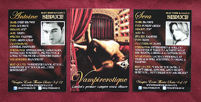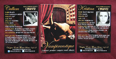 Let the summer of sin begin! The Vampirerotique Summer Book Tour kicks off at Dark Haven Book reviews with a post introducing the Vampire Erotic Theatre romance series! There's also a giveaway for a fantastic swag pack that includes Vampire Erotic Theatre romance series trading cards, signed cover postcards, bookmarks, black rubber "Blood Donor for Snow" wristband, 2013 calendar, pen and a magnet.