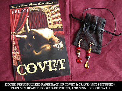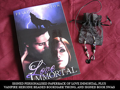 THE PRIZESOne signed paperback copy of Love Immortal , plus VAMPIRE HEROINE BOOKMARK THONG, signed book cover postcards, bookmarks and romance trading cardsOne signed paperback copy of Covet and Crave anthology (two erotic vampire romance novellas in one book), plus VAMPIRE EROTIC THEATRE BOOKMARK THONG, signed book cover postcards, bookmarks and romance trading cardsOne signed paperback copy of Hunter's Moon (vampire romance novel), plus VAMPIRES REALM BOOKMARK THONG, signed book cover postcards, bookmarks and romance trading cardsHere are some pretty pictures. I don't have the Covet and Crave paperback made yet, but it will be sent to the winner as soon as I receive copies and can sign them.