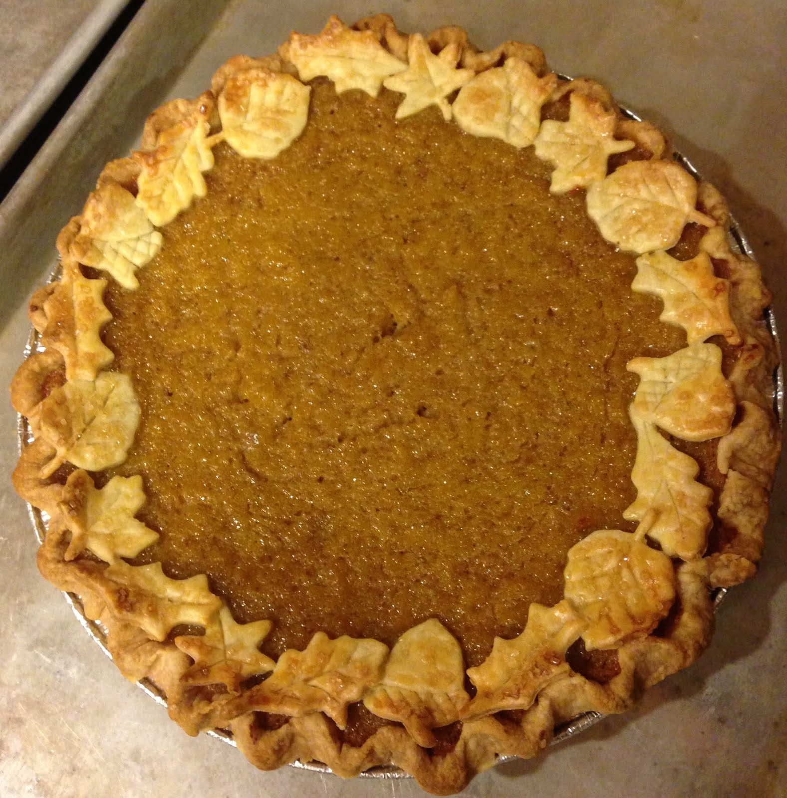 pumpkin pie with fallen leaves garnish