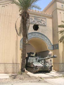 Special Republican Guards have taken over the 11-acre museum complex, although international law forbids anyone to use a cultural site like it for military purposes. But they hide in the buildings and fire automatic weapons and rocket-propelled grenades — RPGs — at the American soldiers.A U.S. tank responds with a single round from its nosebleed 120-mm main gun. It takes out the RPG and leaves a shocking hole in one of the museum’s tall outer walls.
