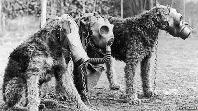 Richardson put his canines through a six-week course of operations before dispatching them to the Front. Terriers are bred to hunt rodents by following them into burrows; like most terriers, Airedales love tunnels, culverts, drains--and trenches. They were perfectly comfortable finding their way through mazes of trenches criss-crossing the frontlines of France, and once accustomed to gas masks, could navigate with less danger. Many of them carried small first-aid kits strapped to their necks and were trained to find the wounded after battle. Others delivered communications tied to their collars.
