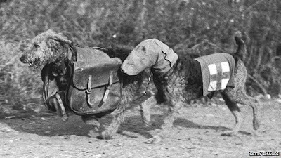 He's a terrier mix, it's true, and less than recognizable to those who love the breed today, but a hundred and one years ago Airedales were still evolving to their present state of perfection. And they were all over the Western Front, serving alongside the Allies as sentries, scouts, messenger-bearers and Red Cross rescue dogs. Some of them were discovered at the Battersea Dogs Home in London, others were donated by their owners, but most were trained by Colonel Edwin Richardson, who lived and worked in Carnoustie, Scotland. He was charged with preparing dogs for military field work at the Front, and quickly realized, he said, that the Airedale Terrier was by far the most able breed he could train, because--to paraphrase Col. Richardson--they cannot be dissuaded. They cannot be stopped. They are a force of nature that when deployed, turns out to be a powerful weapon. The Airedale Terrier became the Official Breed of the British Army.