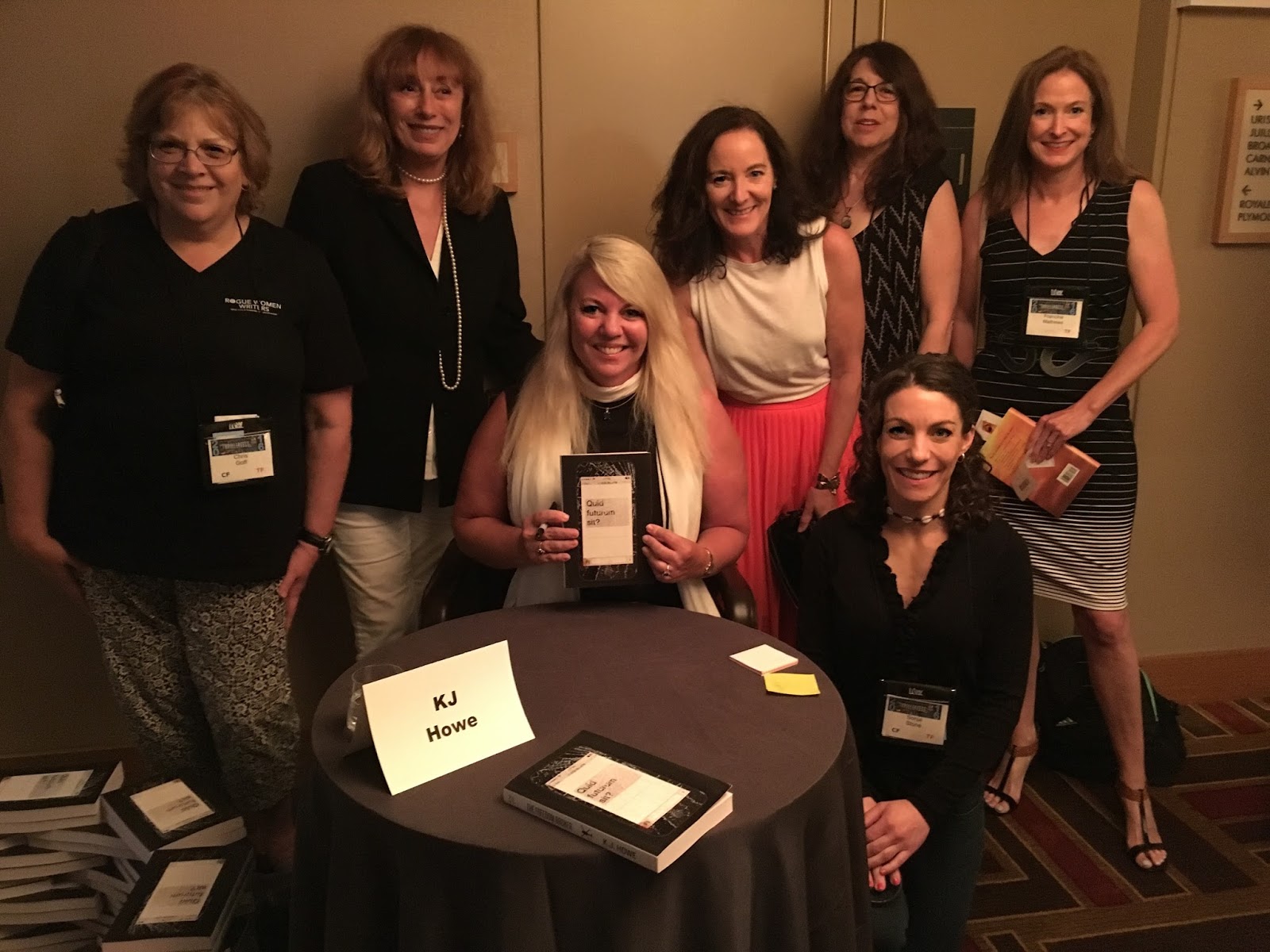 Rogue Women Writers (left to right): Christine Goff, Gayle Lynds, KJ Howe with ARC of new novel The Freedom Broker, Jamie Freveletti, S. Lee Manning, Sonja Stone (kneeling on floor), and Francine Mathews.Fact: we are writing in a traditionally male venue that above all lends itself to violence and action.