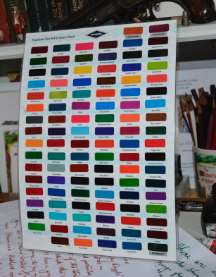 Diamine, with incredible generosity, sent me one of each of their colours of ink. That may not sound much, but when I say that it involved 106 bottles of ink, you’ll get to appreciate their kindness. With these I thought I could write a book using a different colour every day. That way I can assess the way I am writing, I have a quick reference to show progress, and, more important, I keep my own interest going because of having all those luscious colours.