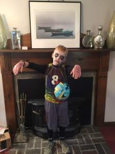 Even though I write mysteries, they are not at all suspenseful or bloody or threatening to most fluffy creatures. I just can’t. I learned long ago my anxiety reaches absurd heights at the slightest provocation. There is not enough Lisinopril in the world to bring my blood pressure down. I’ve been to movies where my eyes were closed most of the time and I had to read the plot synopsis on IMDb. I once tried to read a medical procedural by a super-famous acclaimed author that began in a morgue and after three pages had to bail as the M.E. sliced into the corpse with much gusto and gore. I have never seen Clarice Starling in any incarnation. No Halloween franchise. Even this cute picture of my grandson as a zombie soccer player is unsettling.