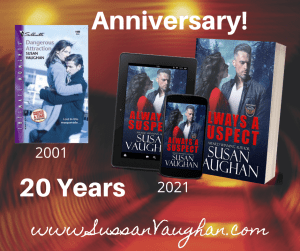 Susan Vaughan here with a book to give away. Two lucky readers who comment will win a copy of Always a Suspect. June is the 20th anniversary of this, my first published book. In 2001, this romantic suspense/mystery was titled Dangerous Attraction and was part of the Silhouette (Harlequin Books) Intimate Moments imprint. Here’s the book description.