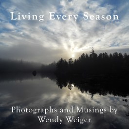 I’ll let Wendy tell you about the book she’s just published. “ Living Every Season guides readers through the cycle of four seasons in the Maine Woods: the frigid white winter; the long, slow reawakening of spring; the lush green summer; and the glorious, almost impossibly bright autumn that fades, inexorably, into the austerity of another winter. Photos range from dramatic vistas of mountains, lakes, and skies to small details casual observers might miss: the delicacy of maple blossoms scattered on spring snow; the earthy colors and rich patterns of a fungus digesting a decaying log. This book will enhance readers’ sense of wonder and will help to open their eyes and their hearts to the natural world around them.”