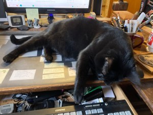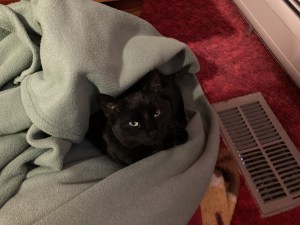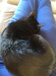 A real breakthrough came when I was sitting on the reclining loveseat a couple of weeks ago. For the first time, she voluntarily hopped up, climbed into my lap, curled up, and stayed for a good twenty minutes, even allowing me to pet her while she was there. Unfortunately, when I had to shift my weight (she’s a big, heavy girl!) she left in a huff and hasn’t yet repeated her act of affection, but I’m hopeful that she’s mellowing toward me.