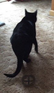 The video was taken when we first introduced Shadow to the concept of the cat door. We installed what is actually the “small dog” size ages ago so our cats could get to the cellar, where their litter boxes were kept. Since Shadow had been living on one floor before she came to us and wasn’t used to stairs, we decided to let her get used to the two main floors of the house first. We put her litter box behind the wood stove and closed off the cat door. It’s only lately that she’s started showing an interest in the cellar, usually when I go down to do the laundry. A couple of times she was even brave enough to go all the way to the bottom of the stairs and step onto the dirt floor, a common characteristic of rural Maine houses. The video shows her trying to figure out how to get through the cat door. She’s since managed it just fine in both directions.