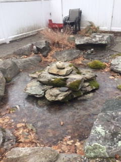 Wrapped in gray cloth to look like a rock. Here is a lovely spot along the Durham Rd in New Gloucester, Maine. Located between my house and my neighbor’s. Wrapped in gray, receiving a gentle covering of autumn leaves, nestled into the old snow fence. If not the entire body, just a few parts…