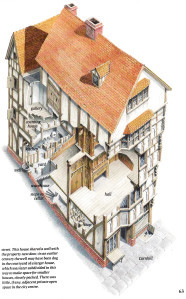 The first time I visited England was between my junior and senior year in college. I didn’t have the opportunity to return until I’d already written the first seven books in my Face Down series. Once again, I relied on photographs and printed floorplans and—thank you National Geographic and similar resources—cutaway recreations of the interiors of sixteenth-century houses and castles, This one is from The Times London History Atlas.