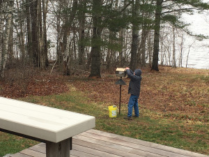 Every year, I have Bernard Brown bush hog the orchard to keep it from being overtaken by poplars, alders and assorted fast growing things. In years past, I’d drive past the old henhouse foundation up a rise, along the blueberry field and across the orchard. There was a line of old apple trees along the stone wall that offered food and hiding places for partridges, but those are long gone. At the end of the wall, a woods road went almost all the way through to the neighbor’s property line. I was a bit uneasy about taking my Hyundai over that terrain, having done so in pick-ups in the past, but the car did just fine, cutting the distance necessary to lug and erect the metal stand. It was late September when I made my first trip, this one with a goal of clearing logs, limbs, etc as well as trimming a pathway to the top of the small hill. Deer use it as their primary hangout because it’s nearly impossible to get to the top without their sensing you. This is because wind currents swirl up there no matter what the weather might be.