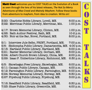 Matt Cost is kicking off his COST TALKS for 2025 next week. These talks will focus on the evolution of a book with special emphasis on his recently released Mainely Mayhem and his upcoming publication of The Not So Merry Adventures of Max Creed.