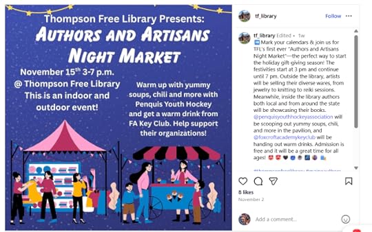 Maureen Milliken will join a variety of Maine authors and other vendors at Thompson Free Library’s Author and Artisan Night Market, 3-7 p.m. Saturday (today!). There’s no admission fee, thre ARE hot food and drinks, authors inside the library and lots of other vendors outside, 186 East Main St., Dover-Foxcroft. The event supports the library and Penquis Youth Hockey.