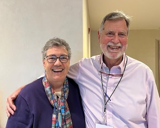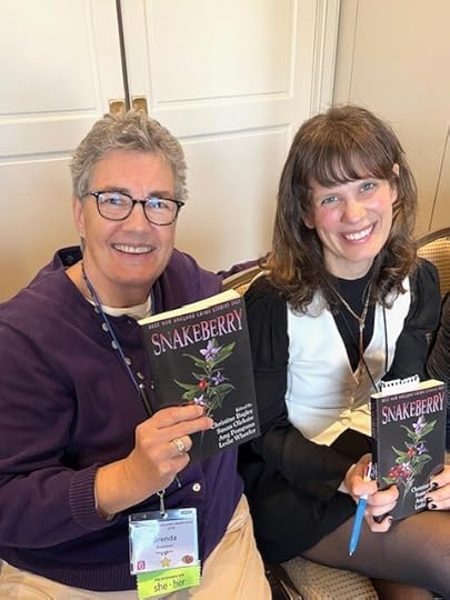 Gabi Stiteler, co-chair of Crime Bake, writes brilliant, gritty short stories. Here we are holding up copies of SNAKEBERRY: BEST NEW ENGLAND CRIME STORIES 2025, which includes her story, MONEY WELL SPENT and mine, CAPE JEWELL.