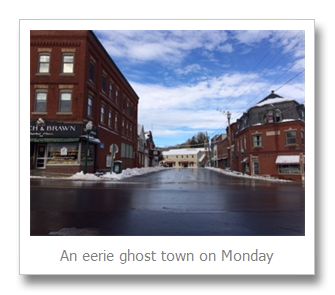 On Monday, the skies were blue and the snow had stopped, but downtown Camden was virtually shut down. Without power and with so many dangerous roads, schools and businesses could not open, and even the post office’s door was locked tight. Only Camden National Bank was open, their generator humming away and fresh, hot coffee on tap for all.