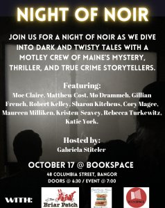 This amazing road trip through the history of Maine Crime will be followed by Noir at Novel. Fellow Maine Crime Writer, Gabi Stiteler has put together an amazing cast of literary legends reading five-minute snippets of their work. This will take place in the very speakeasy vibe of the basement space at Novel in Portland.