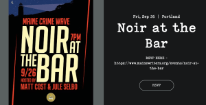 Crime Wave in Portland: A great many amazing crime writers will descend on the city. On Friday, September 26, join us for a tour of the Maine Historical Society’s “Notorious” exhibit, then for a Noir at the Bar at Novel. On Saturday, September 27, register for Crime Wave if you haven’t already! There will be great roundtables, workshops, and speakers. (More info