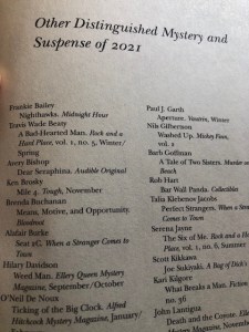 For my part, I did not publish a new book this year, fingers crossed that will change soon. But my short story Means, Motive, and Opportunity, published last fall in Bloodroot: Best New England Crime Stories 2021, made the “Other Distinguished Stories” list in Best American Mystery and Suspense 2022, an honor for which I am grateful.