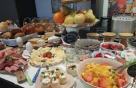 The tubes held an anchovy-roe tasty concoction that was to be squeezed out like toothpaste onto the peeled egg – an excellent salty, fishy addition. There were croissants, coriander buns (fabulous Swedish specialty – see pix I put in below), rye breads and salty/seedy crackers and all sorts of nutty, grainy granolas, heaps of whipped cream cheese and butter, prosciutto, sliced beef, bacon and sausages. And all the fresh fruit anyone could want.