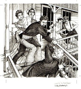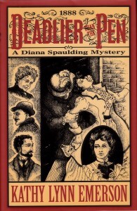 Kaitlyn Dunnett/Kathy Lynn Emerson here, today writing as Kathy and plugging my latest effort at an e-book omnibus edition of backlist titles. I’ve just launched the Diana Spaulding 1888 Mysteries, a collection of four novels and three short stories. My amateur sleuth is a late-nineteenth century journalist who writes for a New York City scandal sheet, the Independent Intelligencer. In the first book in this four-book series, Deadlier than the Pen, Diana is assigned to get an interview with an enigmatic writer of horror stories named Damon Bathory, currently on tour to read selections from his Tales of Terror. She ends up following him to his home in Bangor, Maine (where else would a horror writer live?), a trip that ends up putting her life in danger when they are stranded on a train during the infamous Blizzard of ’88.
