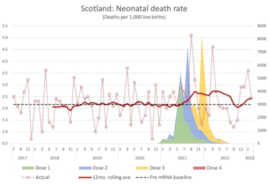 RT by @JoostNiemoller: Toename #sterfte_pasgeborenen (fig, rood) na mRNA prikken (groen, blauw, geel) in Schotland 2021..