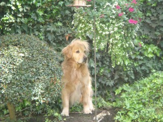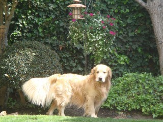 6. And Hunter, our "real" dog, is on high alert for all those pesky birds who are gobbling up bird seed and having the nerve to invade his territory . . .