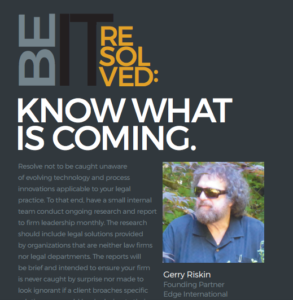 Resolve not to be caught unaware of evolving technology and process innovations applicable to your legal practice. To that end, have a small internal team conduct ongoing research and report to firm leadership monthly. The research should include legal solutions provided by organizations that are neither law firms nor legal departments. The reports will be brief and intended to ensure your firm is never caught by surprise nor made to look ignorant if a client broaches specific solutions you could be deploying to their benefit. Firm leadership can decide how to keep all lawyers informed. This is not an idea but rather an action plan and should be treated as such. It is okay to sail into iceberg-infested waters as long as at least one sailor is in the crow’s-nest. – Gerry Riskin