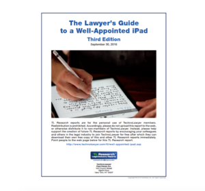 Readers of this blog who are fans of Apple products may be interested in a 27-page report entitled The Lawyer’s Guide to a Well-Appointed iPad (Third Edition), recently published by TechnoLawyer. The report is free, and although it is necessary to sign onto the site to download the PDF, doing so also gives you access to other reports and newsletters in the TechnoLawyer library.