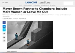 In mid-October, Chris Arnold, a partner at Mayer Brown who was named by Chambers and Partners as one of the year’s top corporate derivatives lawyers in the U.K., protested the lack of women on that and other ranking lists. Overwhelmed by the online support for his protest, he decided to take it one step further, and asked that his name be removed from the 2020 list.