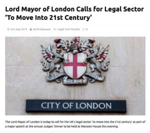 In writing about Estlin’s speech in advance of its delivery, The Artificial Lawyer (UK) pointed out that “at present the UK appears to be doing all it can to support the adoption of new legal technology, including at a regulatory level, but it never hurts to have the City of London and its Lord Mayor fighting your corner.”