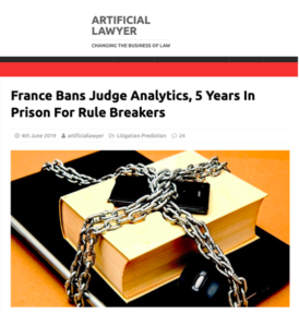The Artificial Lawyer notes that “owners of legal tech companies focused on litigation analytics are the most likely to suffer from this new measure.” The Artificial Lawyer believes that the law – included in Article 33 of France’s Legal Reform Act – is the first instance of such legislation anywhere in the world.