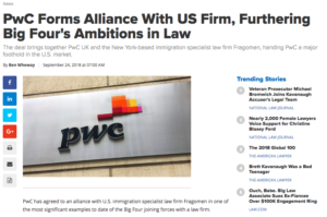 A month ago we reported on the expansion of EY into the legal field through its acquisition of the U.K.’s Riverview Law. Now we learn that PwC U.K. has joined forces with immigration law specialists Fragomen of New York City – giving PwC “a major foothold in the U.S. market,” according to a report in The American Lawyer. Fragomen has offices in 16 major U.S. cities and 25 offices outside the U.S., while PwC offers immigration services in 170 countries.