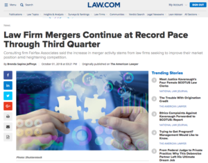 U.S. law-firm mergers to the end of the third quarter of 2018 reached levels unseen in the first three quarters of any year for more than a decade, according to an article published last week at law.com. The number of mergers recorded by Fairfax Associates between January 1 and the end of September of this year stood at 56, up six from the same period in 2017. Twenty of them were completed in the third quarter alone.