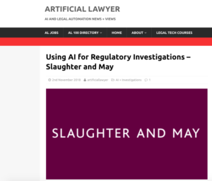 In a recent article for Artificial Lawyer, Richard Jeens and Natalie Osafo – partner and associate respectively at Slaughter and May – point out that regulators and corporates are increasingly using artificial intelligence (AI) to carry out investigations. They offer the example of a complex matter conducted by the Serious Offences Office in the UK (investigations into Rolls Royce, advised by Slaughter and May), in which the SOO used AI to reduce the amount of time required for a document search from a typical two years to one month.