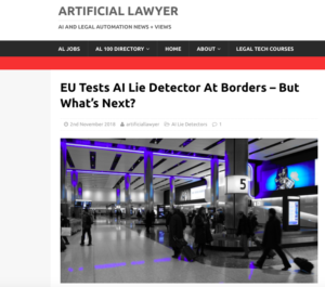 As the Artificial Lawyer article points out, if adopted, the system would give decision-making powers relating to a legal area to machine-learning-based technology. “Given that lying at a border in an attempt to gain entry would likely constitute a criminal offence, then this software has important human rights and justice implications.” The author of the article goes on to imagine other legal contexts in which similar approaches might be applied in future – by police, courts, and other legal entities.