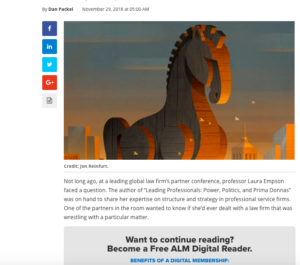 Packel points out that the attainment of this milestone follows several years of “concerted push” on the part of the accounting firms, who had earlier been discouraged from encroachment into the legal field by the 2002 Sarbanes-Oxley Act in the U.S., and similar measures in other countries. In his comprehensive and timely article – titled “Big Law’s Trojan Horse: Are The Big Four Preparing an Invasion?” –Packel explains how the major accounting firms have worked around the strictures of legislation to position themselves as strong competitors to Big Law in the offer of legal services globally.