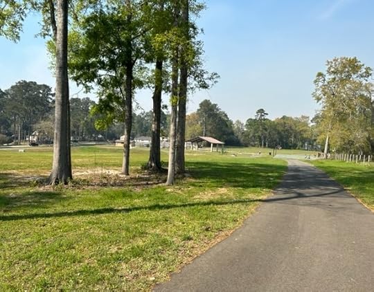 Now the pecan trees are gone. A few oak trees have been saved around the edges for which I’m very glad. The railroad bed has disappeared after much bulldozing. Where there used to be a sluggish swamp during heavy rains and a thick patch of woods now there is a retaining pond. A very nice wide paved walking/biking trail winds all the way around what was our pasture as well as what was already a recreational park. The trail is one mile long and is very nicely situated where many people can enjoy it.