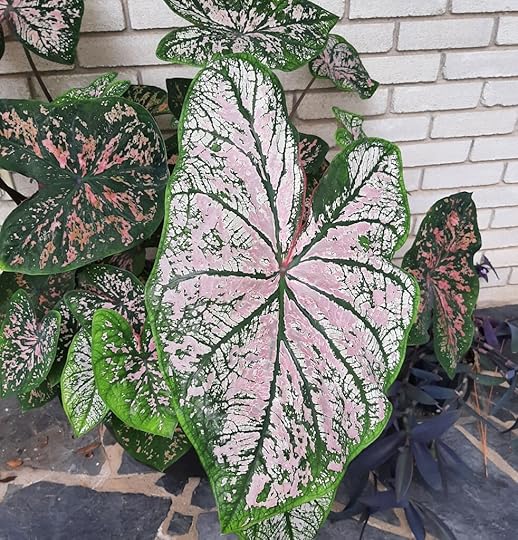 We have tried for years to find a bright plant that likes the white brick wall under our kitchen window on the patio. The place gets a nice dose of morning sunshine but none in the afternoon. We inherited an old black wash pot from Grandma Graham and we planted at different times geraniums, begonias, bougainvillea, impatiens and pansies. None of them thrived, most died. Ferns would be pretty, I thought. But I really wanted something colorful against that white brick wall. We decided to try one more thing: caladiums.