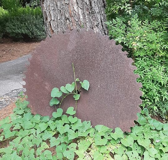Charles pulled up unproductive lemon trees and planted the potatoes in their place between a marten house and a big pine. One of our old relics, a rusty round saw blade, is propped against that tree. The vines grew this way and that. They would have crept over the driveway if Charles hadn’t redirected them. They stretched behind the saw blade, wrapped around the pine tree, covered the area with lush leaves. Then one day we noticed it: a vine peering through the hole in the center of that saw blade making it look like a huge rusty face sticking out a green tongue. We had to laugh at the stubborn persistence of that potato vine.