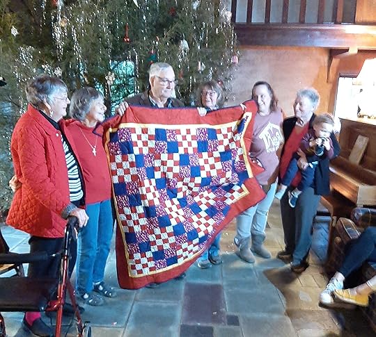 It isn’t Christmas, I know. It’s Memorial Day. But it was the day after Christmas in our family home, Stone Gables, when our friend Judy Purdy of the Quilts of Valor organization surprised our brother, Charles C. Knight (army veteran 1963-66) with his very own quilt of valor. Several family members–sister Suzanne Dover, sister-in-law Reggie Knight, and I–had enjoyed sewing squares for the quilt. Suzanne and Judy put it all together and quilted it with Charlie’s wife, Elaine, and daughter, Evelyn, involved in final touches. Most of us, along with other close family members, were there for the sweet, short ceremony by the Christmas tree.