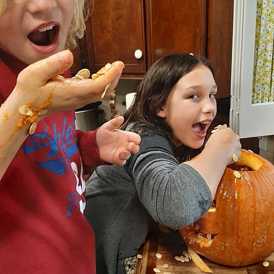 Charles had carved a jack-o-lantern with a smooth smile. The kids insisted he (the Jack) should have teeth. So Grandaddy accommodated. By the time I came on the scene, the assistants were replacing teeth they’d knocked out in their enthusiasm and sticking them back in place. They declared themselves dentists right then and there. But that wasn’t all. As the activity developed, Charli, first to start digging out the insides, discovered she could shoot seeds out of old Jack’s mouth. Then, of course, Kaison made it even more fun by shooting seeds as far as they would go. Both kids’ hands were covered with seeds and pumpkin innards. They even pretended to eat the slime! All in all, the pumpkin carving was more fun than a trip to Chuck E Cheese. Grandaddy and I sat down to enjoy the show. We had to dodge flying seeds and, finally, call for a washing up and sweeping.