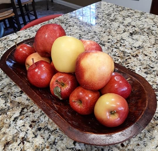 An apple is such a friendly, wholesome fruit. Years ago I determined that, no matter what, I would always have apples in a bowl on our kitchen island. What a ready and delicious snack! Our grandchildren love them. They’ve learned to eat them to the core instead of throwing half-eaten ones away, although recently I’ve been mystified by someone who takes one bite from an apple and leaves it in the bowl. I have my suspicions about who it is but haven’t been able to catch the biter “apple handed.” Apples serve the double purpose of being delicious and looking beautiful and inviting in the bowl. Today I have a variety of fresh, wonderful apples brought to me by friends Billy and Louise from their annual trek to north Georgia and North Carolina. Knowing how I miss the mountains, they brought me this treat.