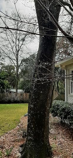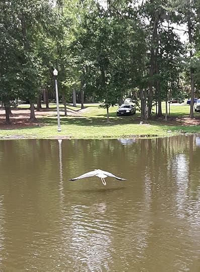 There were a few ducks nearby, such different fowl from the heron. They swam and feasted, sometimes simultaneously, moving effortlessly from one area to another. The ducks were playful, pestering each other, diving head first into the cloudy water and coming up a distance away. The tall heron was silent and stood for long minutes as still as one of the sweetgum trees or oaks nearby, only his alert eyes seeming to move at all.