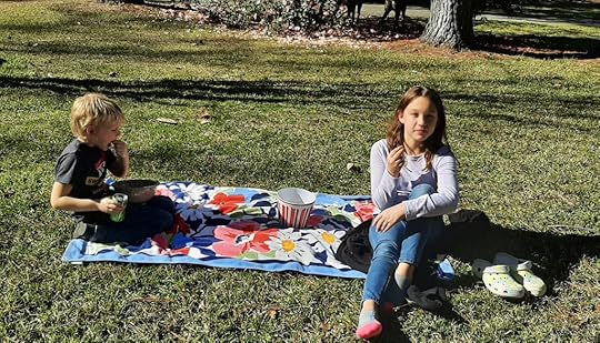 Charli found the bright beach towel I sent her for, Kaison hauled a packet of popcorn out of the pantry. With some bickering they popped the corn, poured it in bowls, and headed out to a nice grassy place near the mulberry tree. Munching on popcorn and sipping sodas, they were happier than clams on the seashore. They tossed kernels in the air and tried to catch them in their mouths. It was nice no one would have to sweep popcorn from the den floor! I huddled, shivering, on a bench nearby, joining in their chatter and a guessing game or two, then watched them play badminton. They didn’t worry about the wind blowing the birdie in all directions, just thought it was funny.