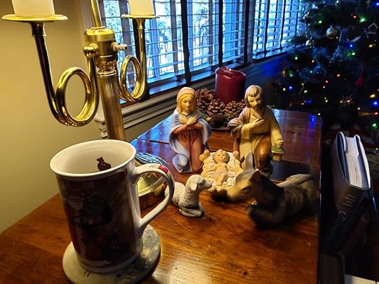 Sit with me by the fire while the wind whines around the corner of the house. Have a cup of Christmas. Choose between hot cocoa, Russian tea, pumpkin spice coffee, caramel latte, or just plain coffee steaming hot. Enjoy the Christmas tree glowing with colored lights and sparkling ornaments. Feel the anticipation of Christmas as you see the stockings hanging empty ready to be filled on Christmas Eve. Take a look at the Nativity scene on a side table with shepherds, wise men, and the Holy Family casting shadows from the lamplight. Oh, and here, have a cookie please–sugar cookies in Christmas shapes, thumbprint cookies with a dab of mayhaw jelly in the clevities, chocolate covered pretzels, and spiced snowballs.