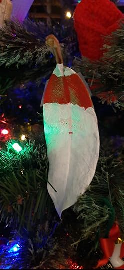 This year some of us painted brittle smooth magnolia leaves for Christmas tree ornaments. Mattie decorated her large leaf with red and white peppermint stripes. Charli and I did Santa Claus faces with the pointed part of the leaf all white beard. Kaison, though asked to to please do something Christmasy, chose to make a very colorful monster, then made crosses at the edges saying they stood for Jesus protecting us from the monster. You might think these decorated leaves could not be preserved from one year to the next but this entire art project originated from a leaf decorated by Debbie Ashley, our Christi’s mom, many years ago. That leaf, cherished in the family’s beautiful collection of ornaments, is still bright and intact, a “steel magnolia.”