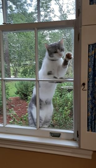 It became a ritual every morning to see if the new cat was still here. She always was, though she wouldn’t sit on the kitchen window sill with the other cats, whether they wouldn’t let her or whether she knew she didn’t belong. Instead, she came to the breakfast room window and yowled her heart out there. Yes, yowled. I took a picture of her thinking it was a picture of longing to belong. I was sorely tempted to let her in.