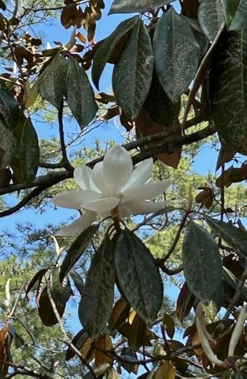 The blossom reminds me of an elegant porcelain chandelier, especially with sunlight sifting in. Other blooms high in the trees make me think of brides awaiting their magical moment. I think, too, of “Steel Magnolias,” the Dolly Parton movie in which beautiful women show what they’re made of when tragedy hits.