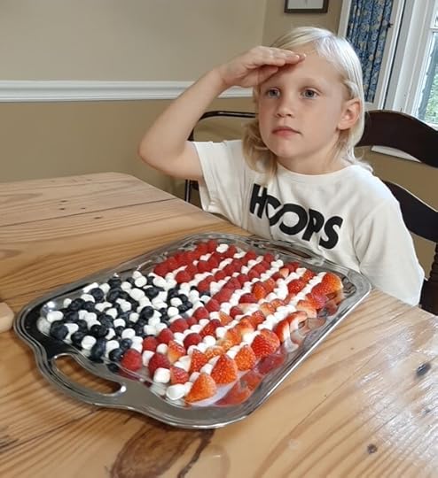 Looking at this picture reminds me of the fun we had that day making the sweet flag. Of course we ate some of the berries and baby marshmallows as we constructed the stars and stripes. But the best part of the whole experience, to me, was the sight of Kaison voluntarily saluting that flag in all seriousness. Saluting the flag wasn’t enough. He jumped up, scrolled quickly on his phone to a flag with National Anthem playing and, there in our kitchen, we sang and saluted with earnestness and volume. Another time, with no berry flag to salute, Kaison instigated a flag ceremony including Granddaddy as we stood solemnly in our breakfast room singing lustily with cell phone accompaniment, “Oh, say can you see….”